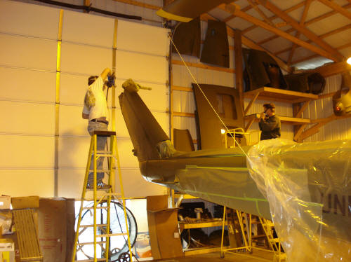 | Doug refinishes 803's tail after the new fin spar was installed | |