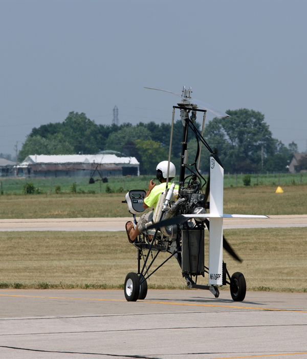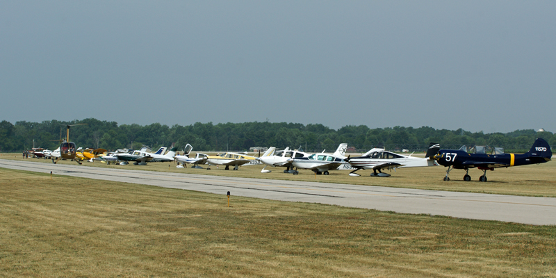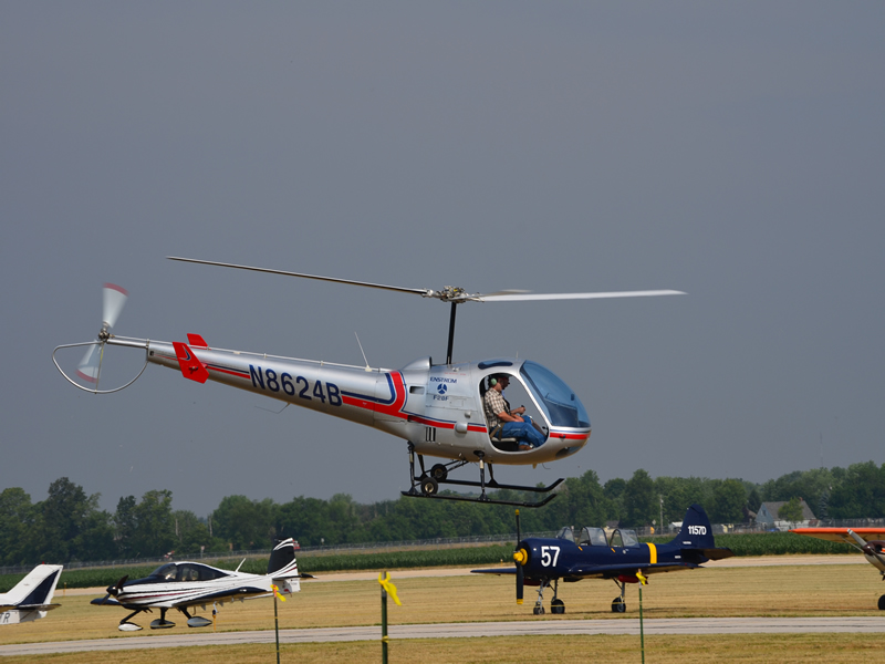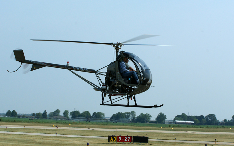| A Robinson makes it's way down the taxiway past several fixed wing aircraft |
