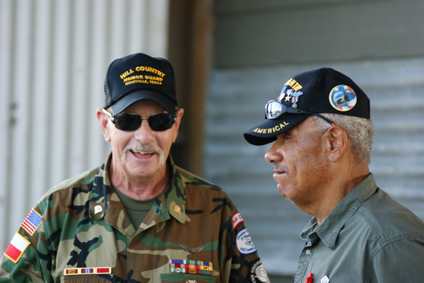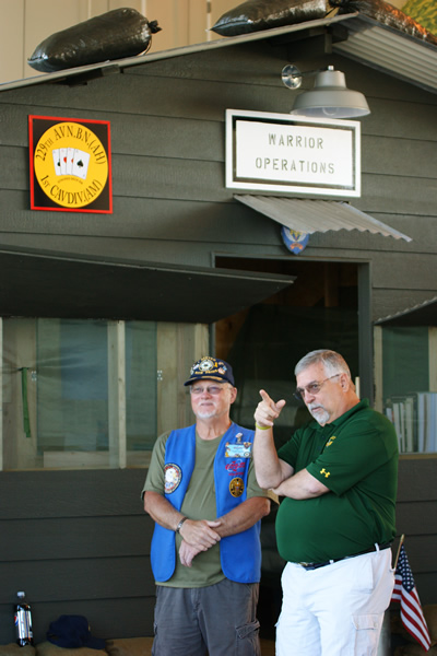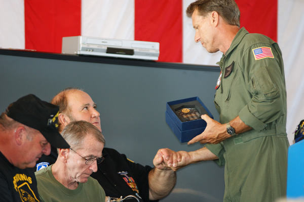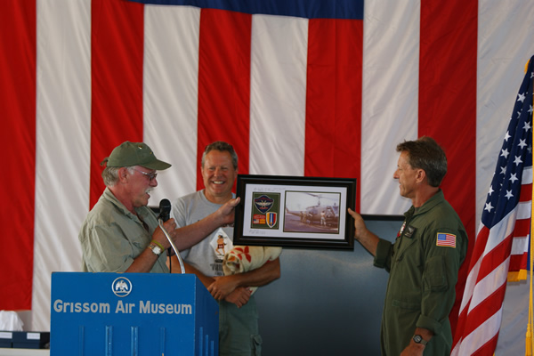 Pat Lund presents John and Alan Walker with a photo and patch of his unit, the 165th Trans. Co. |